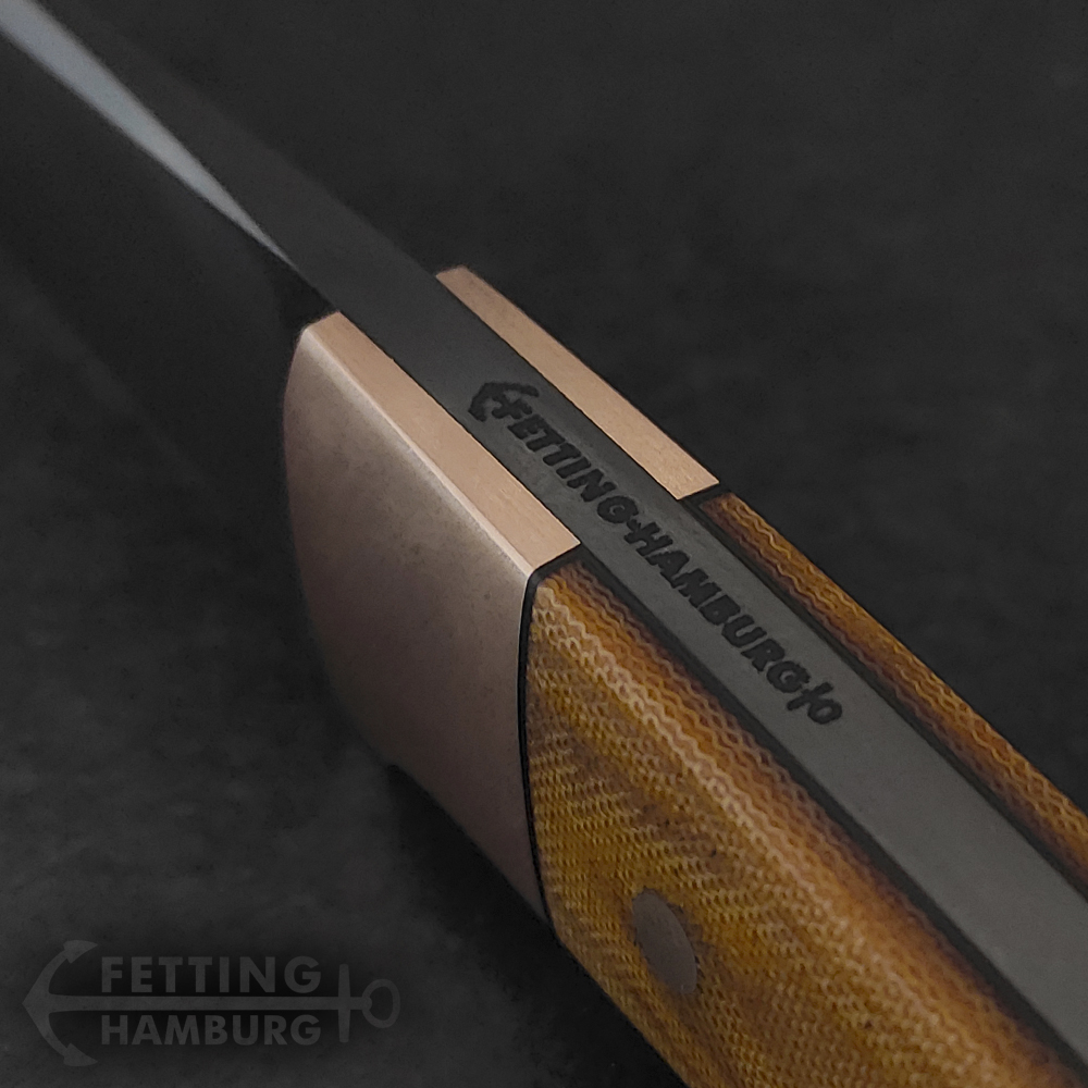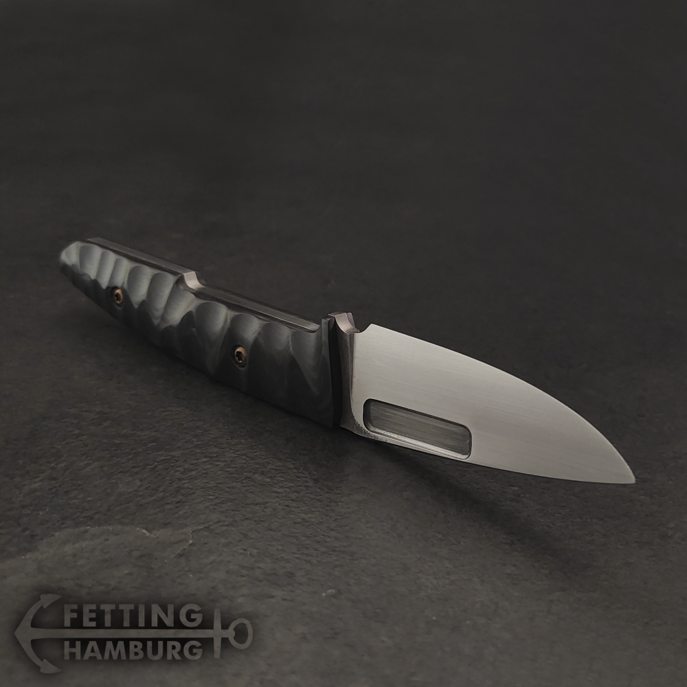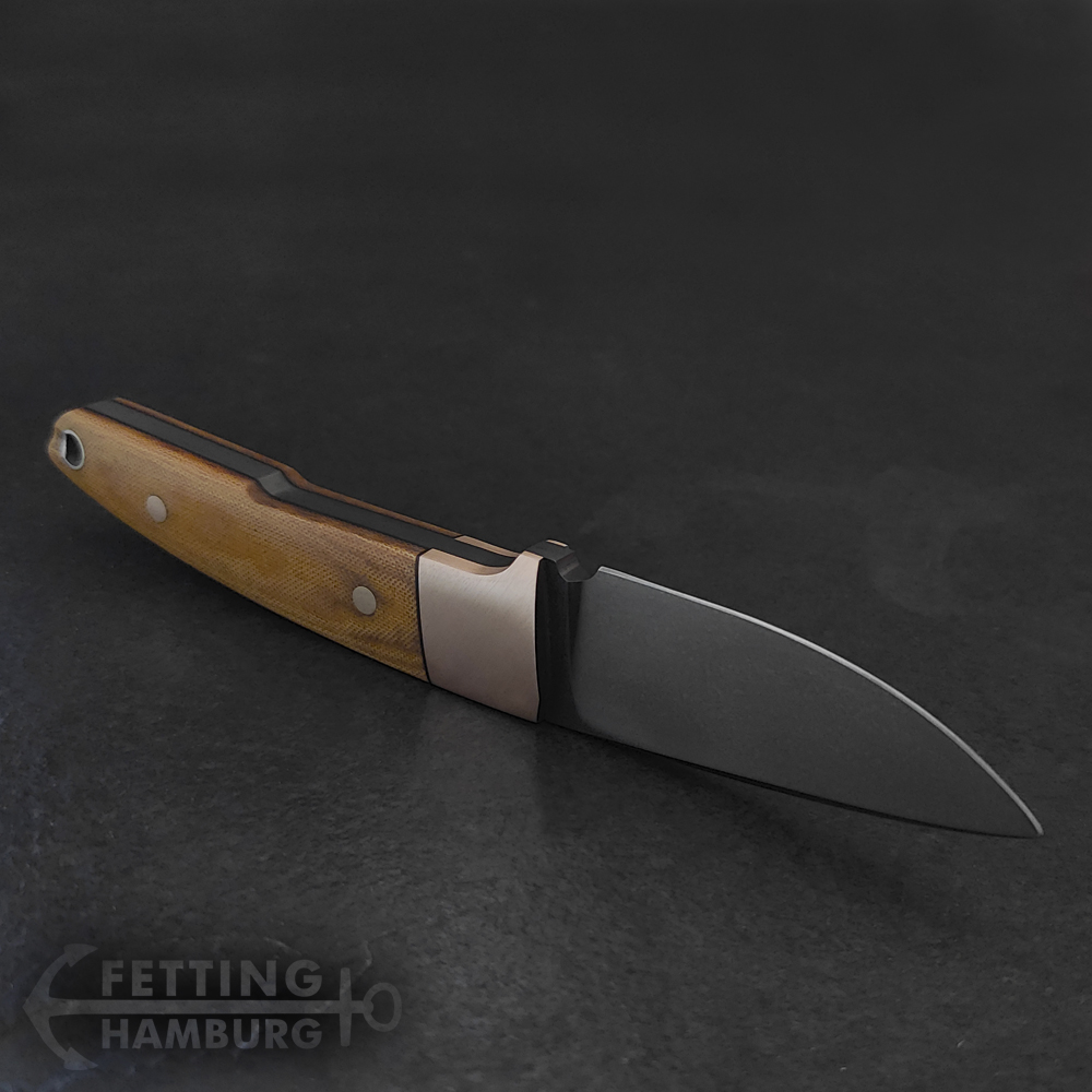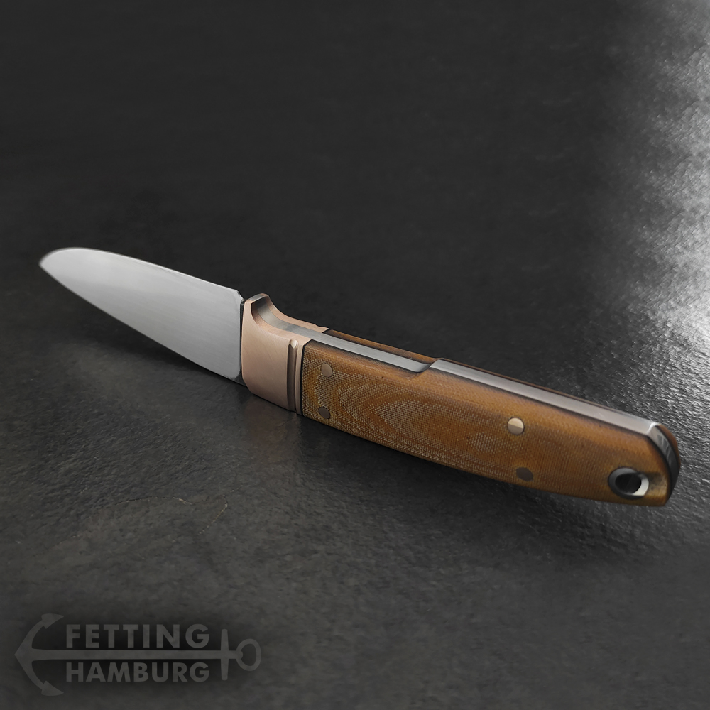 Das Ergebniss ist ein kleines EDC für Stadt und Natur, mit einer 65mm – 80mm Klinge aus m390, 1.2442, Damast oder 1.3505 und ca 9.5-10cm Grifflänge, mit Bronze oder Inox Backen oder ohne, mit Rahmen aus Bronze oder Micarta. Ein kleines, sehr vielseitiges Messer.