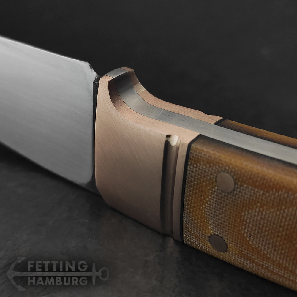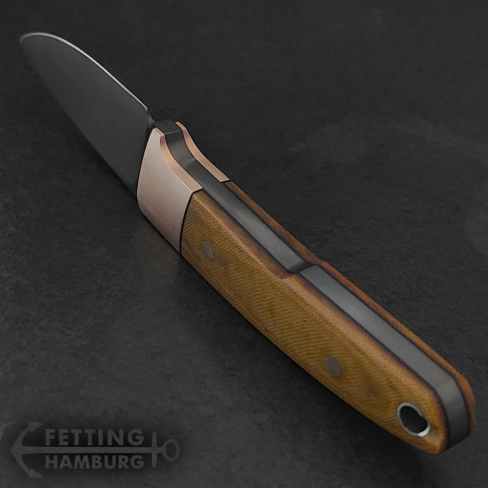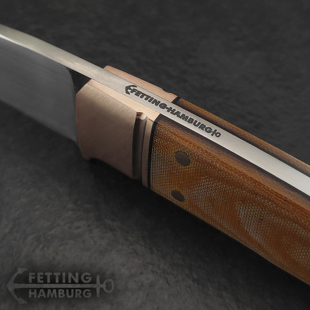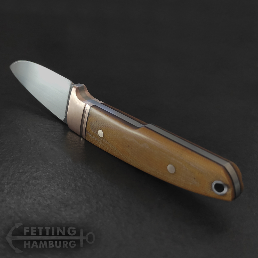 Das Ergebniss ist ein kleines EDC für Stadt und Natur, mit einer 65mm – 80mm Klinge aus m390, 1.2442, Damast oder 1.3505 und ca 9.5-10cm Grifflänge, mit Bronze oder Inox Backen oder ohne, mit Rahmen aus Bronze oder Micarta. Ein kleines, sehr vielseitiges Messer.