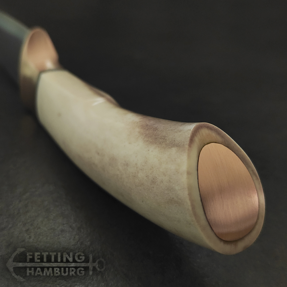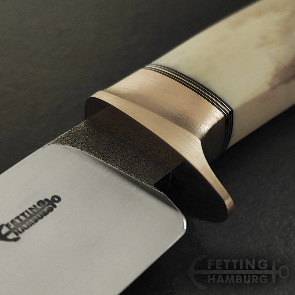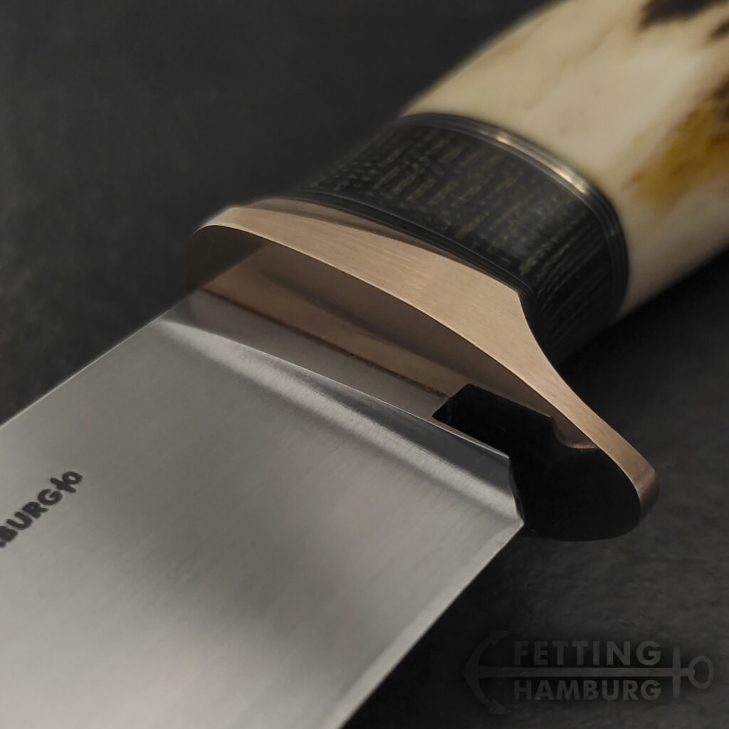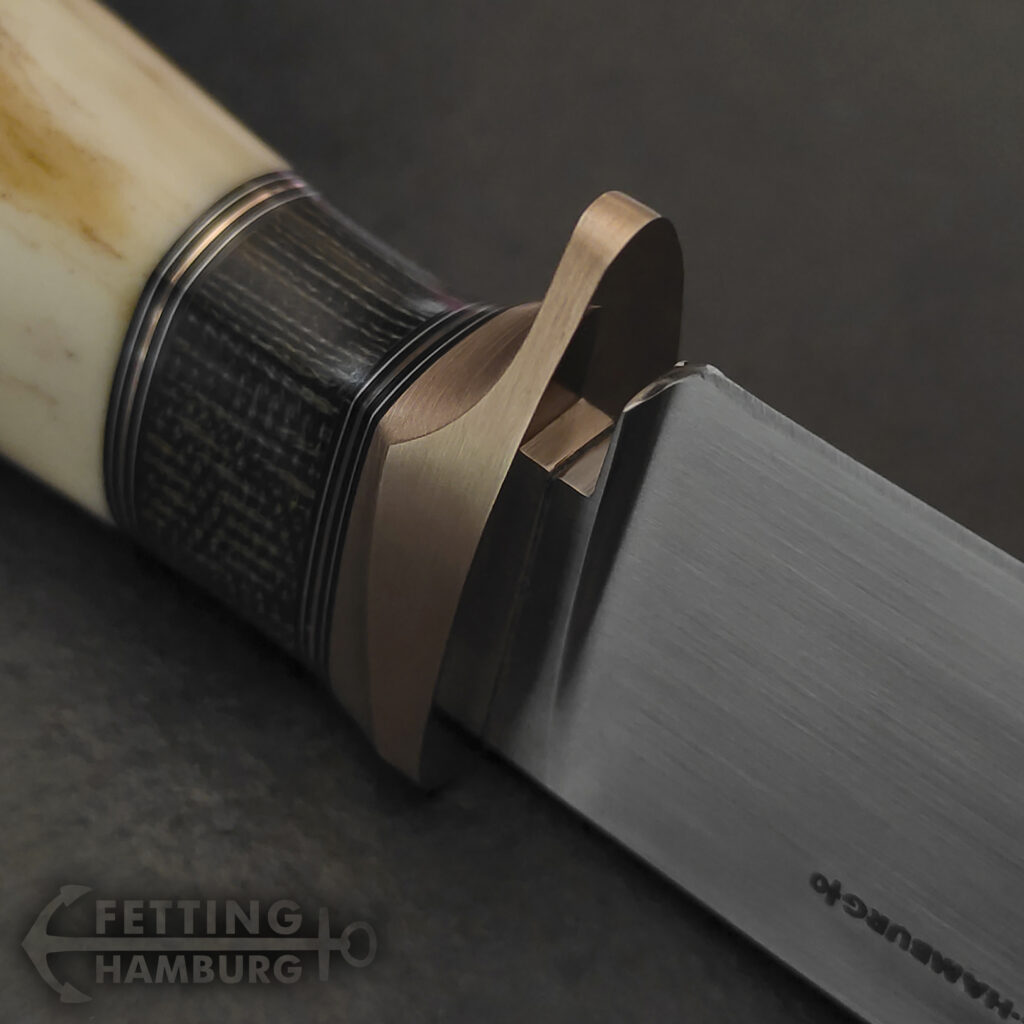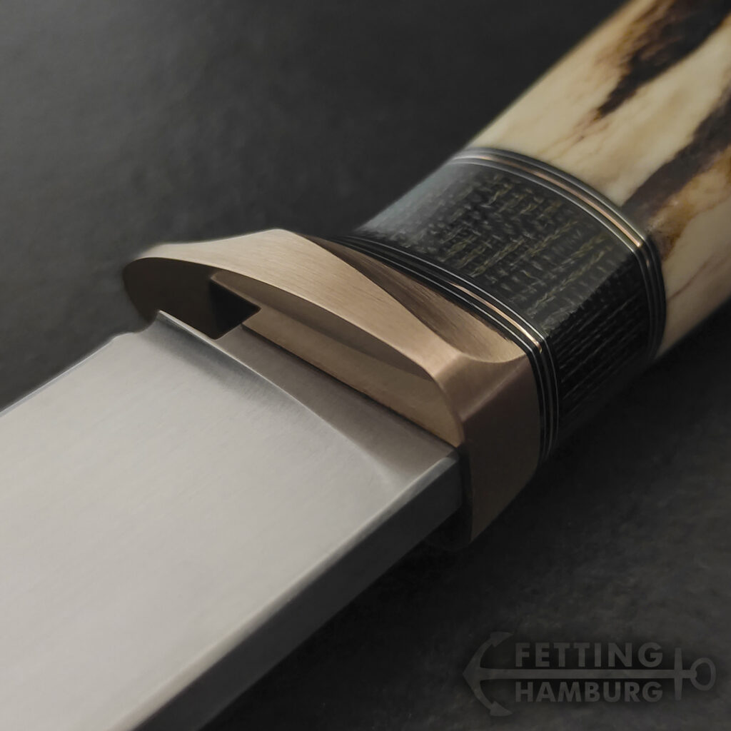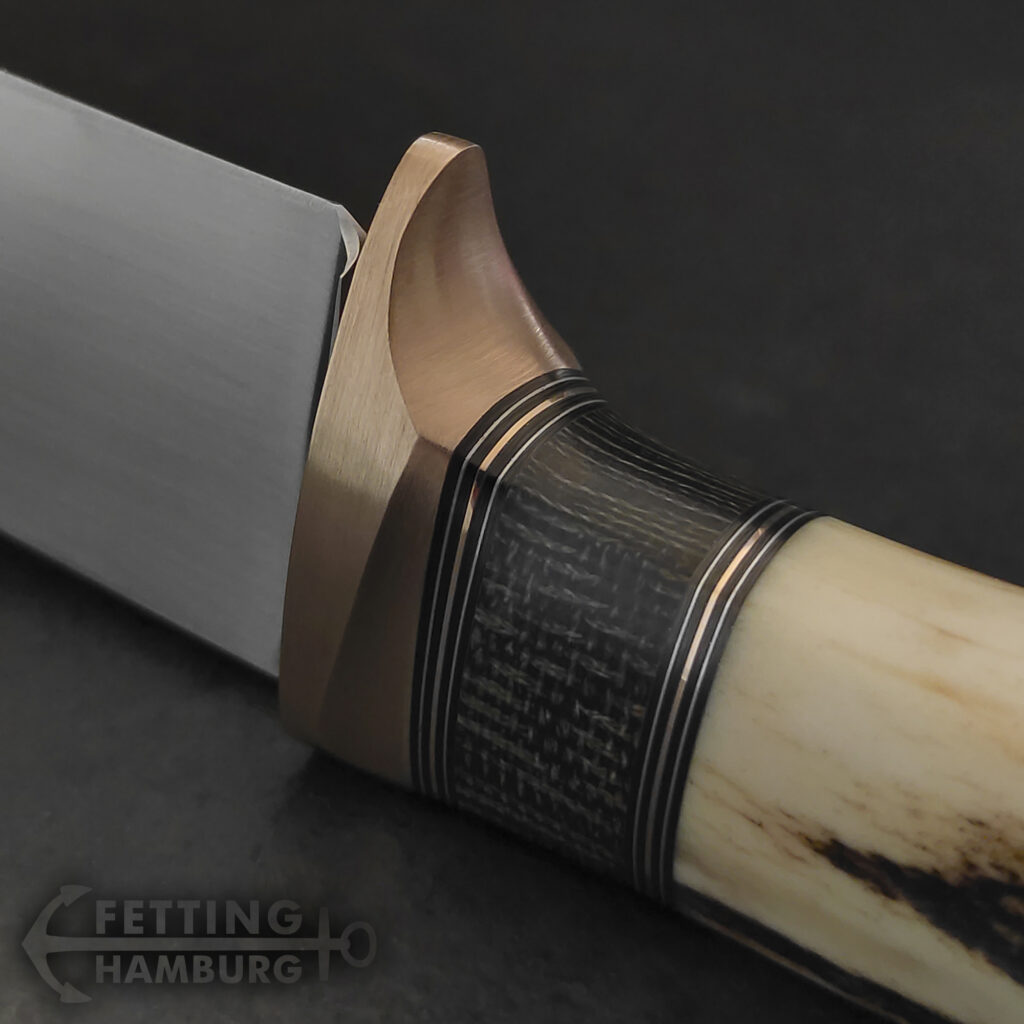 Der Griff besteht aus mehreren Lagen Vulkanfiber, Alu, Kupfer, Micarta, Mammut Elfenbein, Büffel Horn – Es gibt unbegrenzte Möglichkeiten einer individuellen Gestaltung.