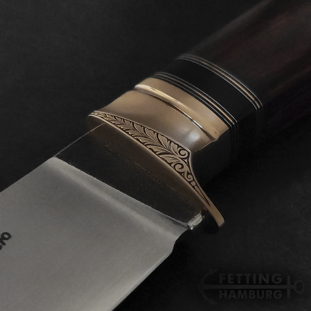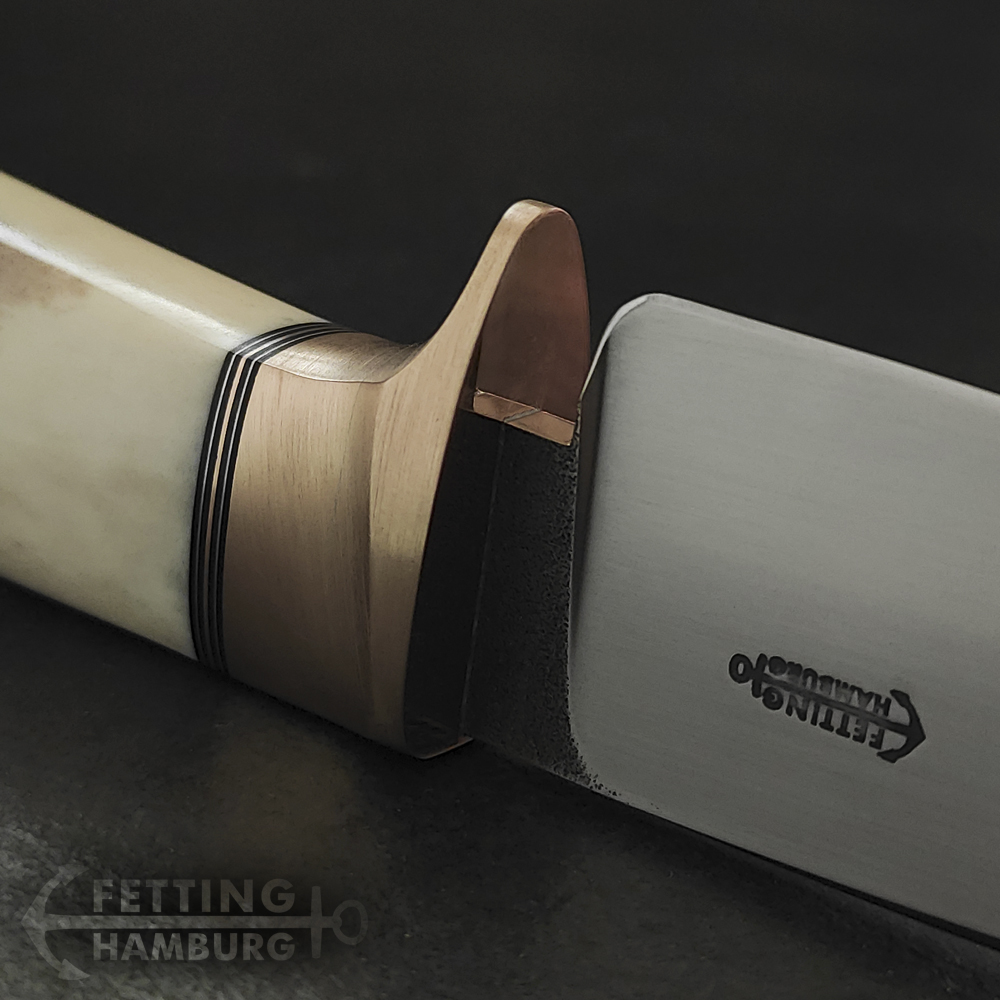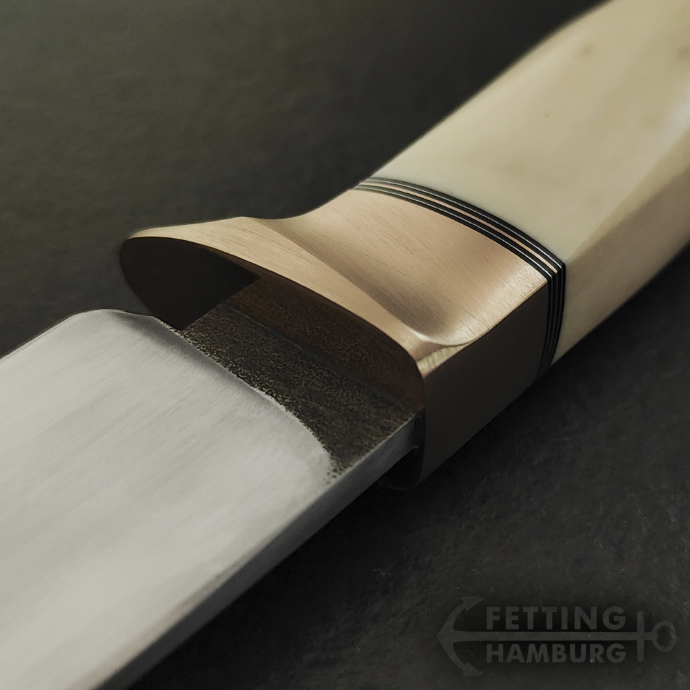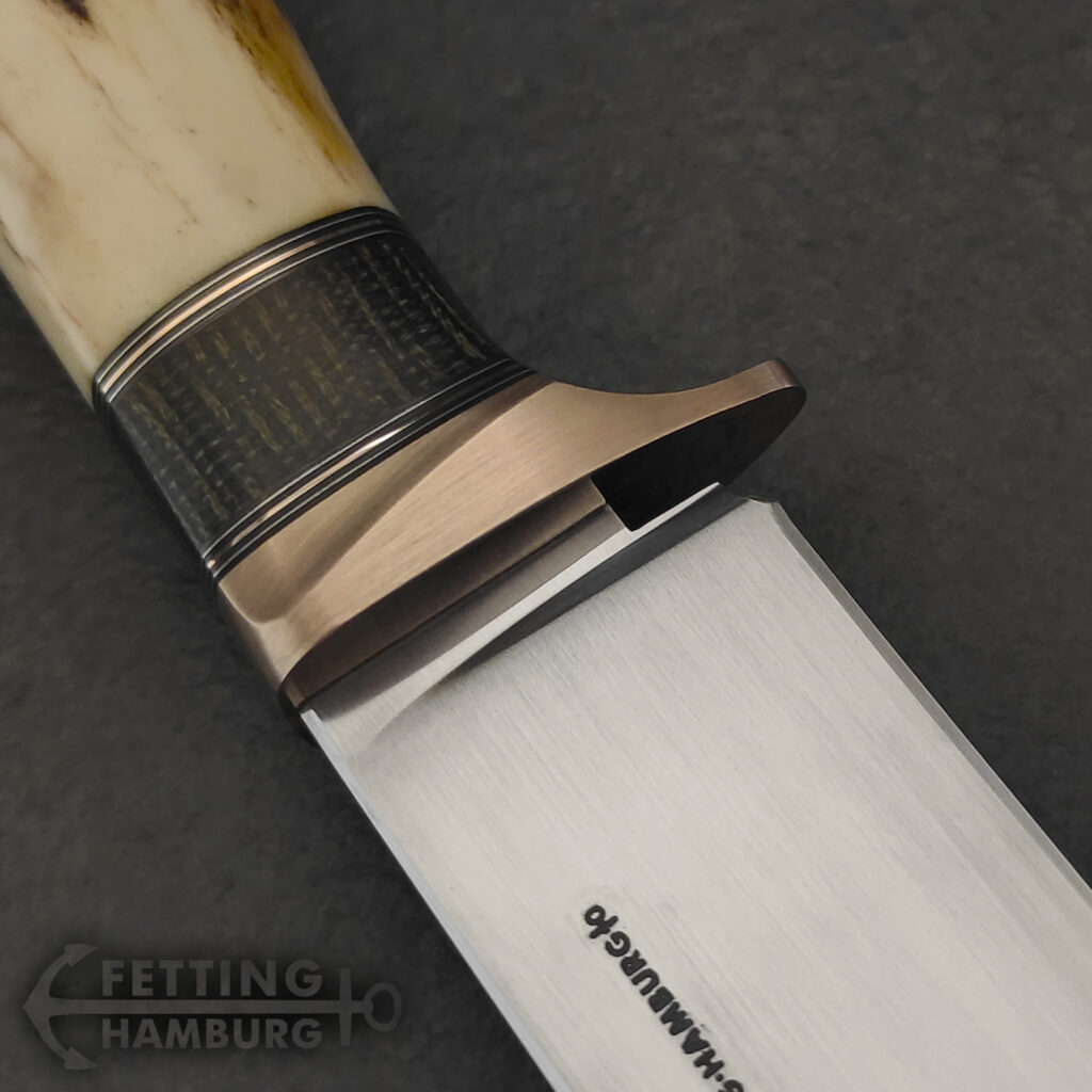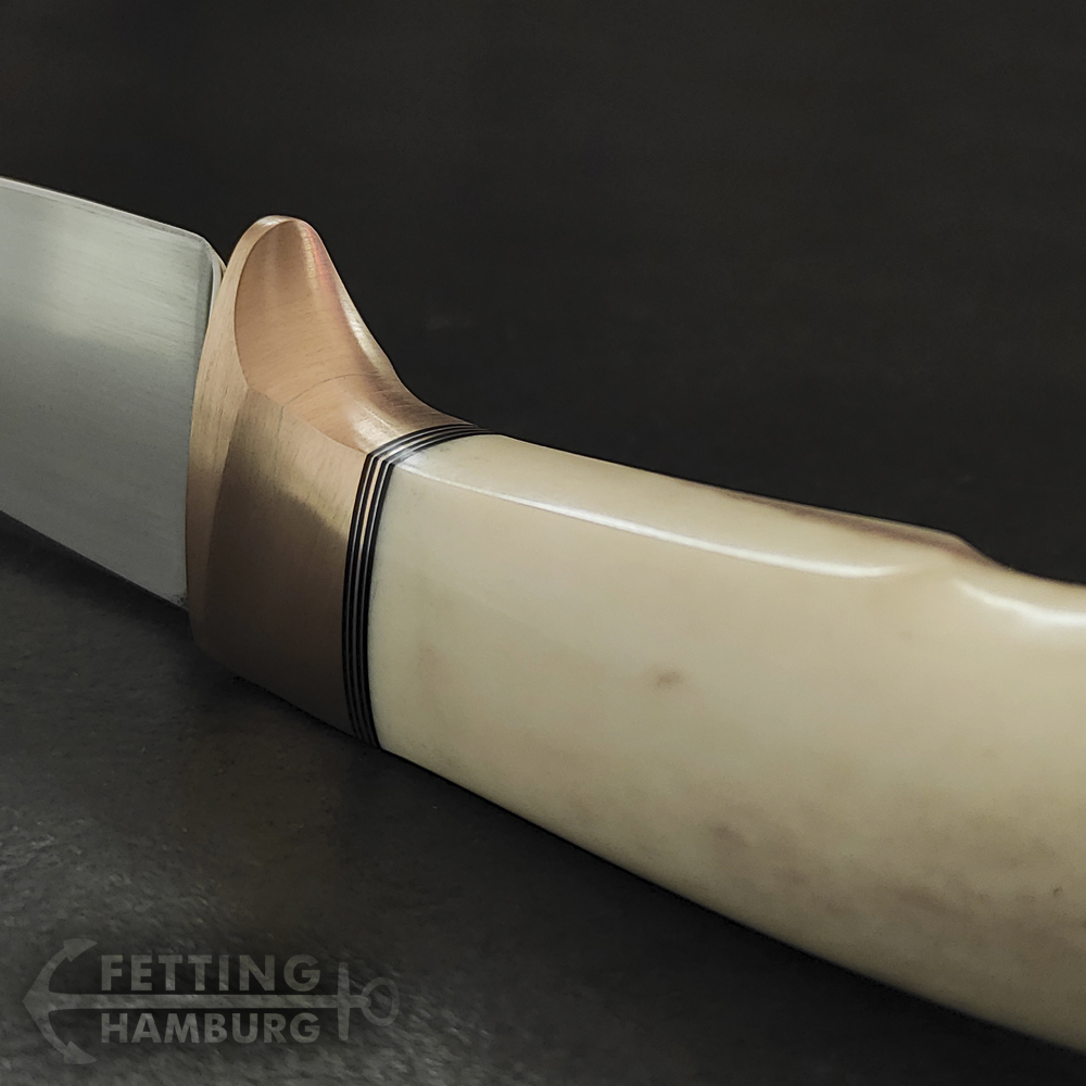 Der Griff besteht aus mehreren Lagen Vulkanfiber, Alu, Kupfer, Micarta, Mammut Elfenbein, Büffel Horn – Es gibt unbegrenzte Möglichkeiten einer individuellen Gestaltung.
