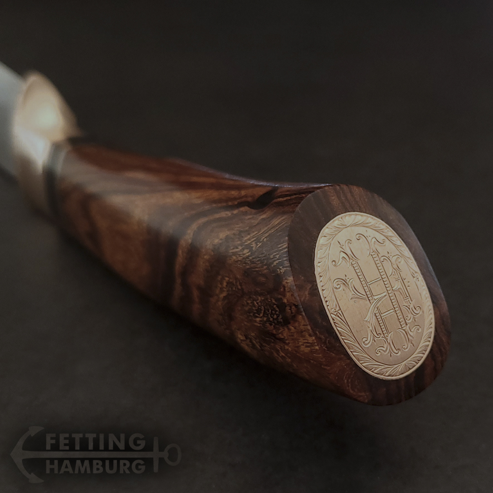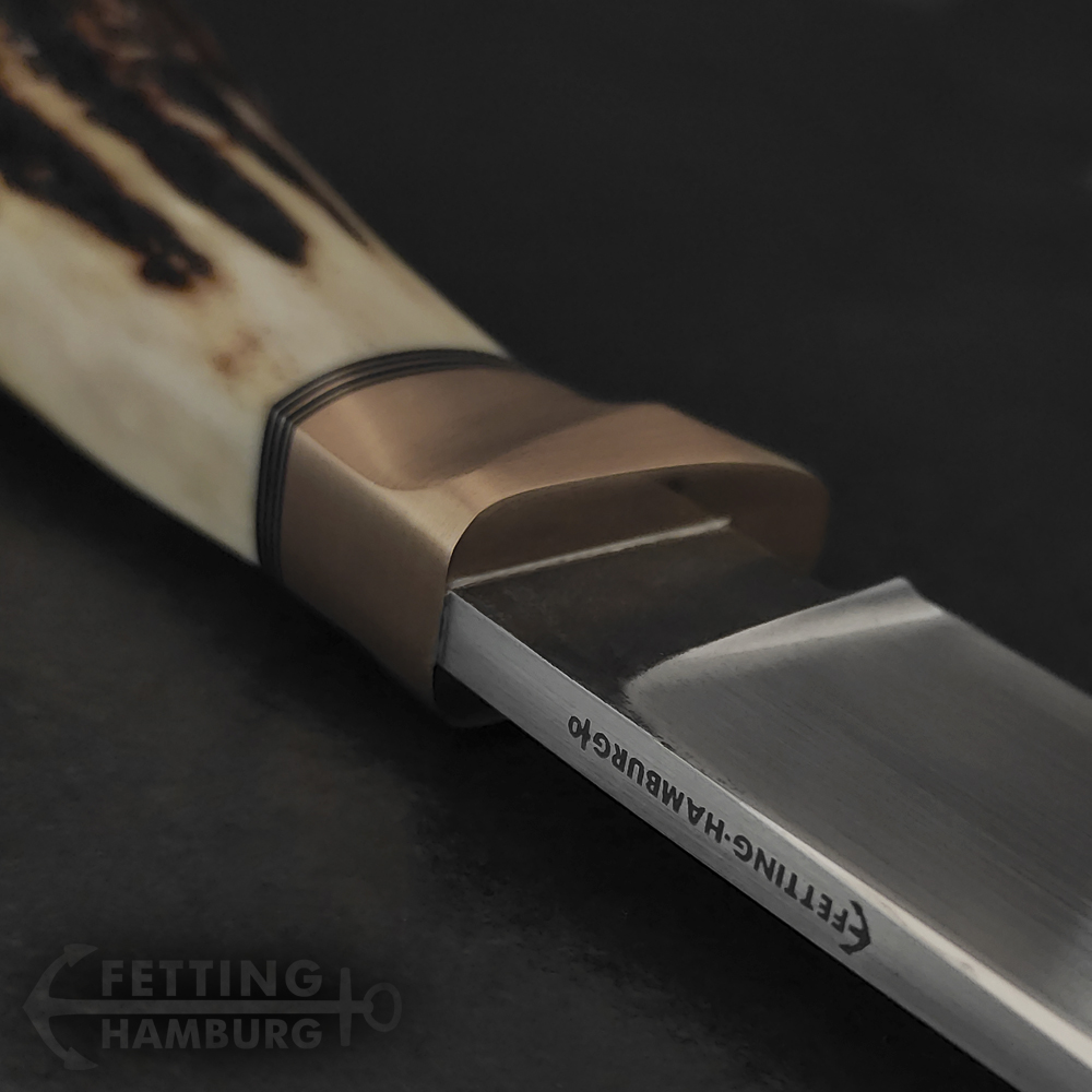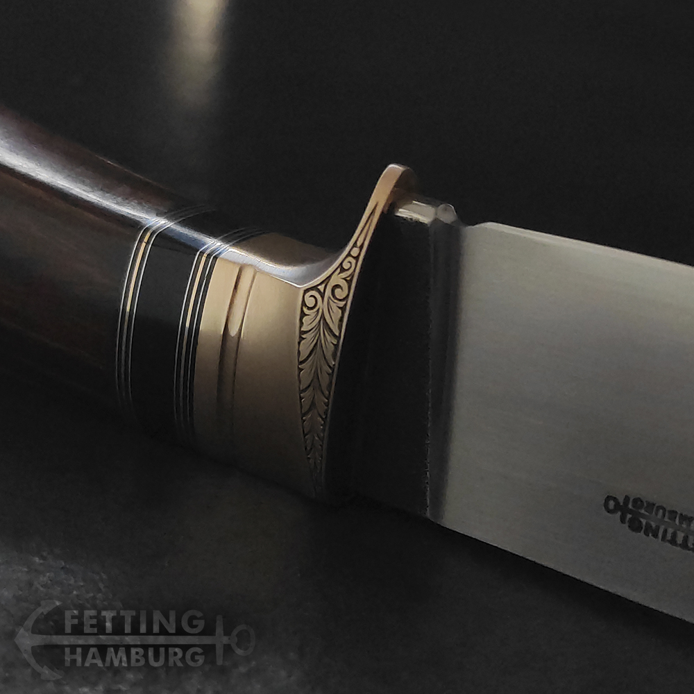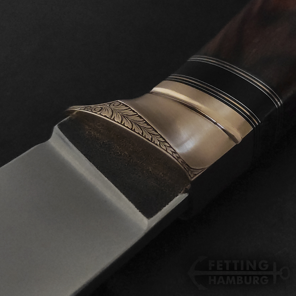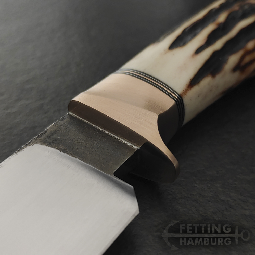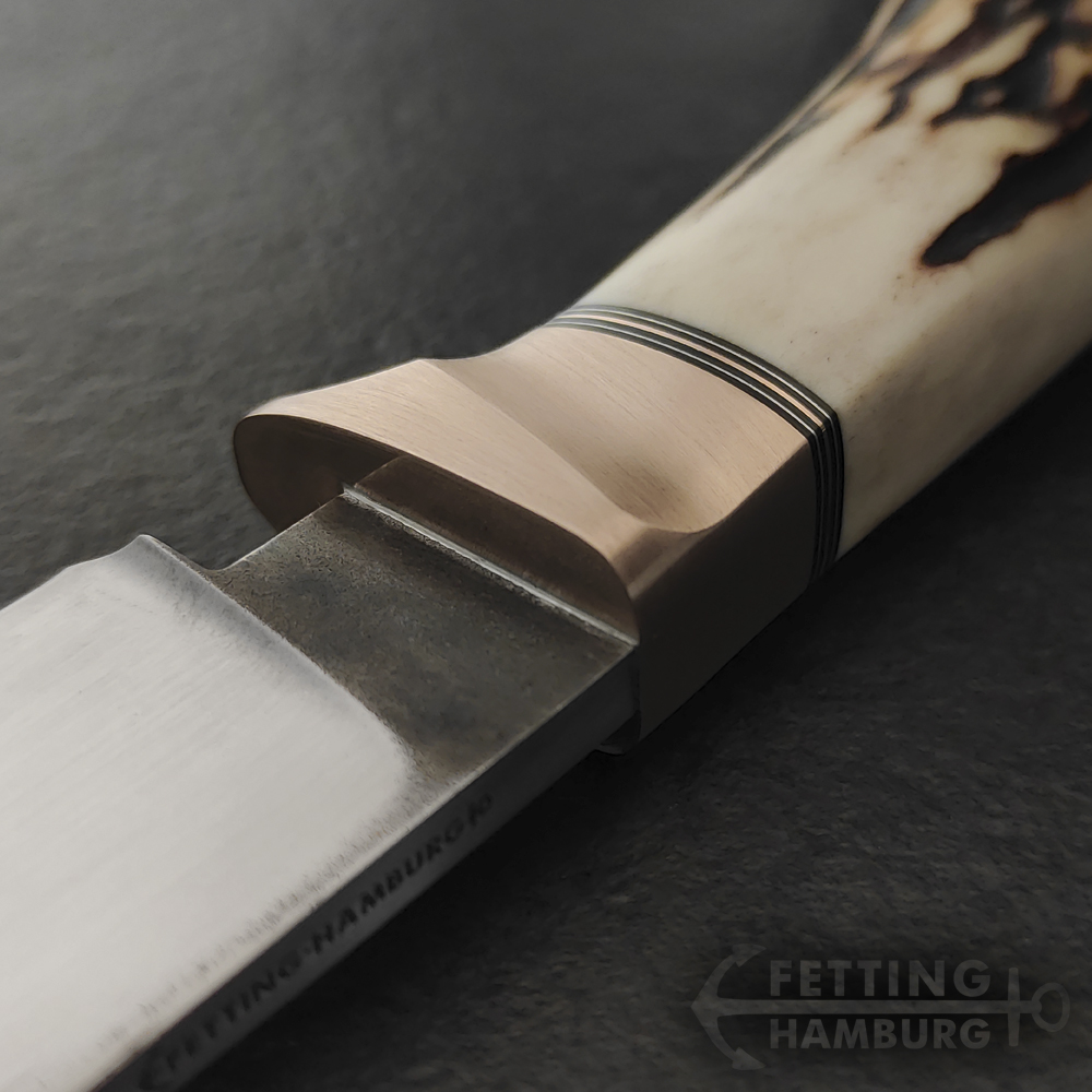 Der Griff besteht aus mehreren Lagen Vulkanfiber, Alu, Kupfer, Micarta, Mammut Elfenbein, Büffel Horn – Es gibt unbegrenzte Möglichkeiten einer individuellen Gestaltung.