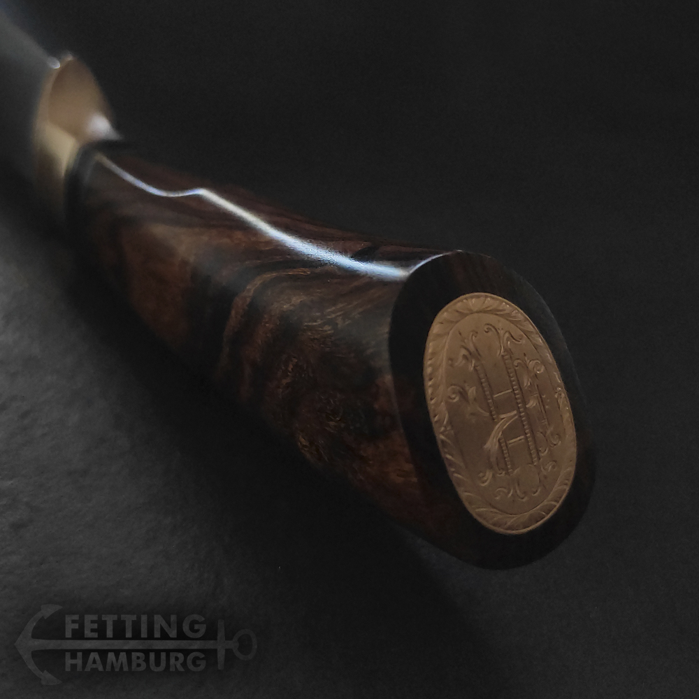 Der Griffabschluss ist entweder naturbelassen, aus dem gleichen Material wie dern Handschutz oder auch Büffelhorn, Mammut Inlays, Silber oder mit einem eingelassenen Patronenboden. Klinge: 110-120mm Material: m390 bzw. 1.4220-02 / QPM20-4, 1.2442, 1.3505, Damast, Damasteel Bauweise: Steckerl